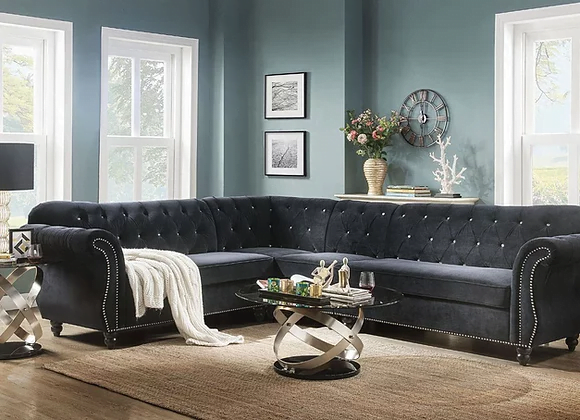 The stunning Regan sectional sofa is the perfect elegant and eye-catching addition to any space. This unique L-shaped sectional features a luxurious black velvet fabric with crystal-like button tufting on both the backrest and arms of the frame. Rolled arms accented with nailhead trim further upgrade the piece to another level. Create a contemporary living room with the sectional that has more than meets the eye. Whether you are entertaining or looking for a place to spread out and relax the sectional is ideal with style and comfort.